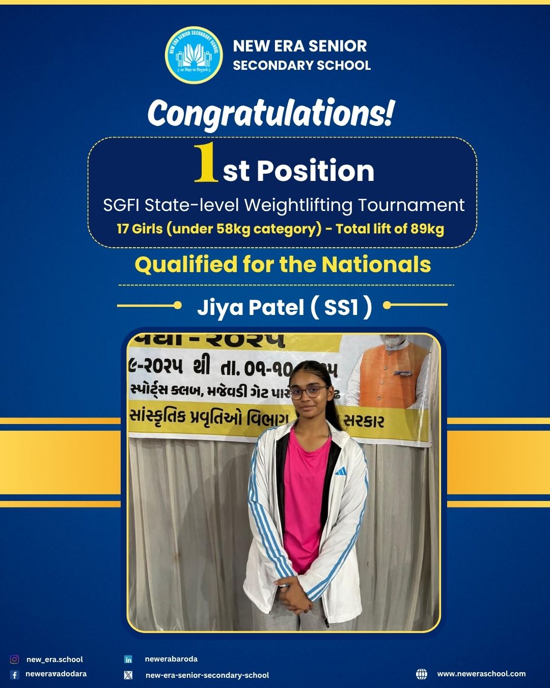 A Moment of Pride for New Era! We are delighted to share that Jiya Patel of SS1 has clinched the 1st position in the SGFI State-level Weightlifting Tournament in the U-17 Girls (Under 58kg category) with a remarkable total lift of 89kg. Her hard work and dedication have not only brought her this victory but also paved the way to represent at the Nationals. The New Era family applauds Jiya’s stellar achievement and extends heartfelt wishes for continued success at the Nationals. #NewEraSchool #StudentAchievements #Weightlifting #SGFI #NationalsBound #prideofnewera