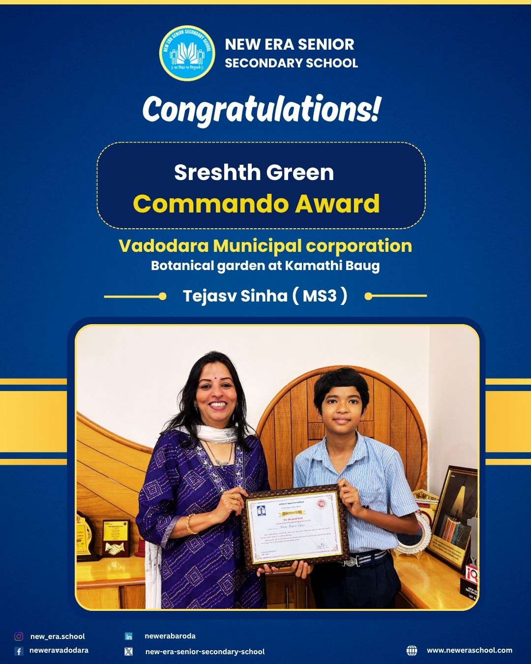 Sreshth Green Commando Award Proud moment for our school as Tejasv Sinha (MS3) was honoured by the Vadodara Municipal Corporation with the Sreshth Green Commando Award for his innovative idea of developing a Botanical Garden at Kamathi Baug. His vision for a greener, cleaner Vadodara reflects true environmental responsibility and creative thinking. #NewEraSchool #StudentAchievement #GreenInitiative #YoungChangemaker #EnvironmentalAwareness #ProudMoment