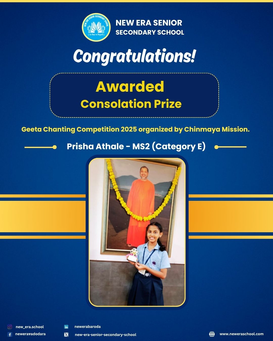 Our young New Eraites made us proud at the Geeta Chanting Competition 2025 organized by Chinmaya Mission! Nivan Raval (UKG-C) secured the 1st position at the City-level final round and qualified for the State-level competition, among 1200+ participants from various schools.