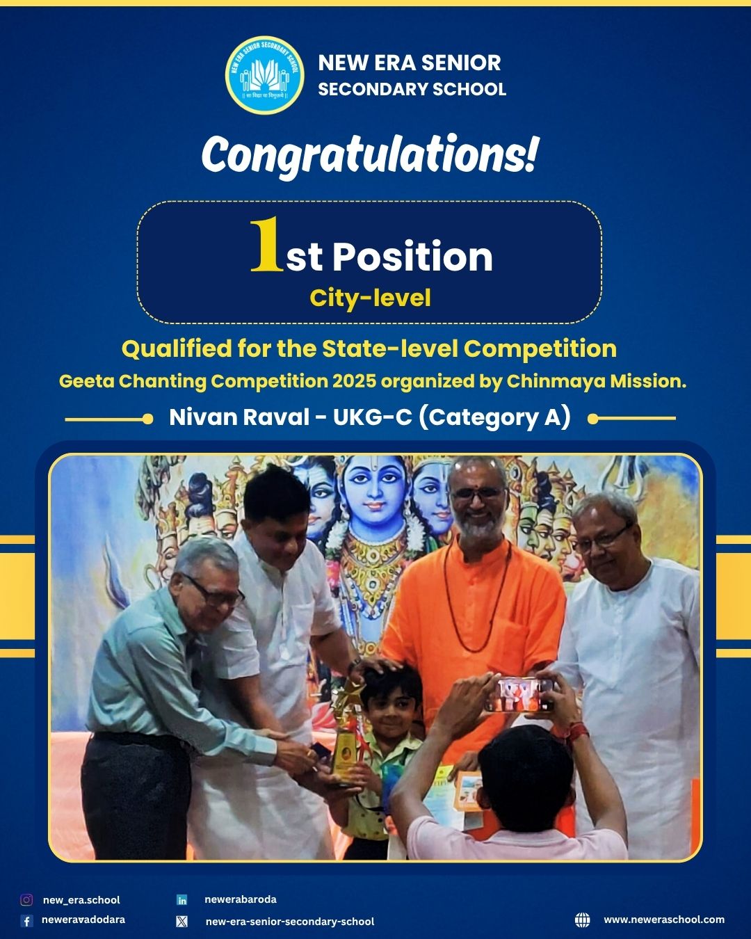 Our young New Eraites made us proud at the Geeta Chanting Competition 2025 organized by Chinmaya Mission! Nivan Raval (UKG-C) secured the 1st position at the City-level final round and qualified for the State-level competition, among 1200+ participants from various schools.