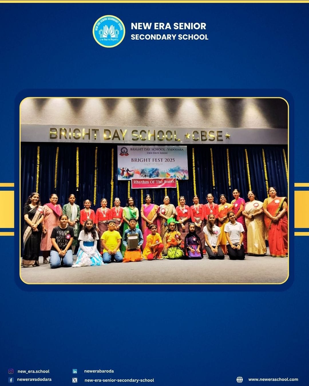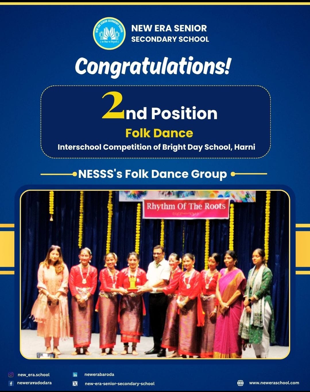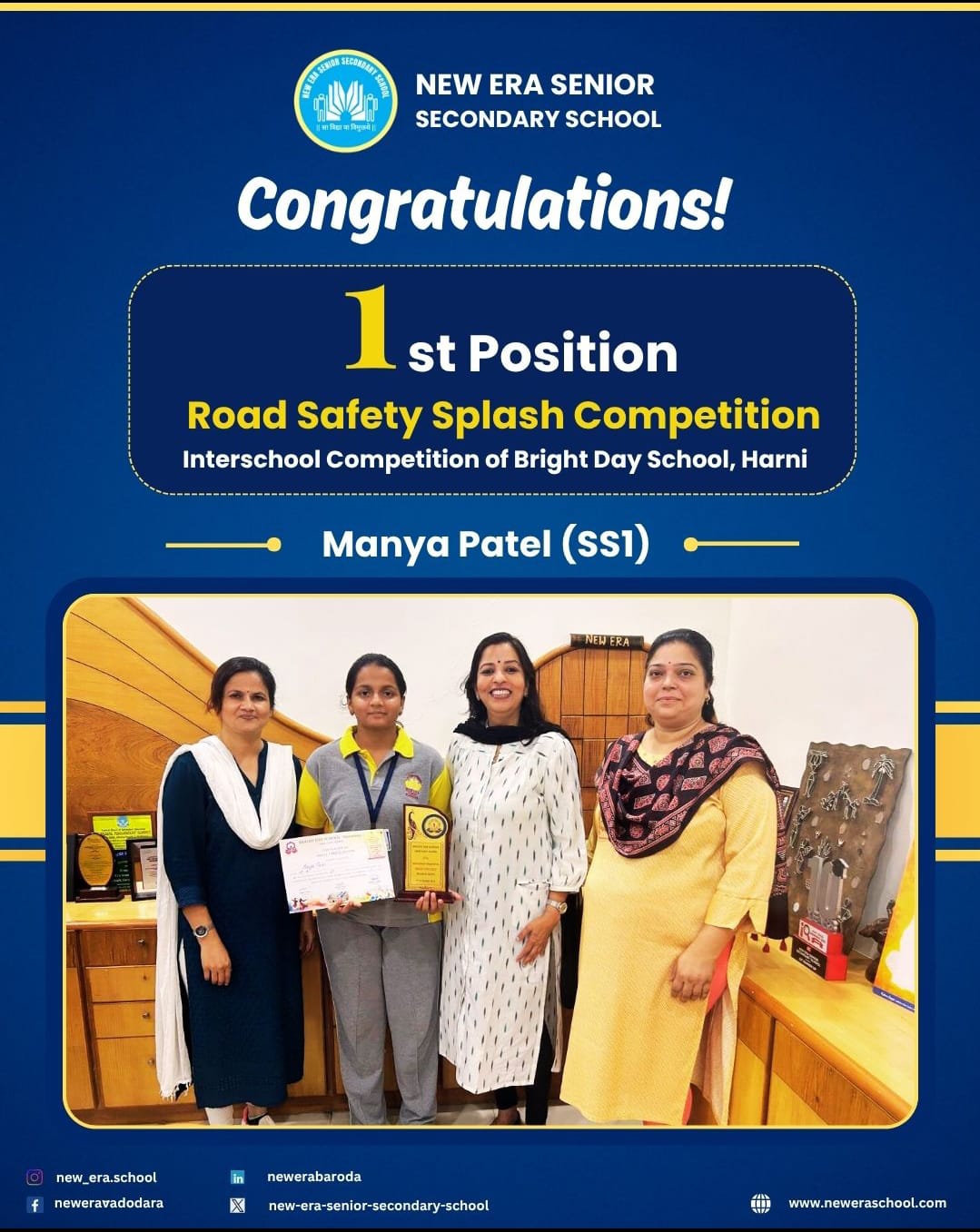 New Era students brought laurels to the school with their outstanding performances at Bright Day School, Harni. Saanvi Tiwari (PS1) secured the 1st position in the event “Down the Memory Lane,” while Manya Patel (SS1) bagged the 1st prize in the Road Safety Splash Competition. Adding to the achievements, the Folk Dance Group of NESSS showcased a vibrant performance and secured the 2nd position.