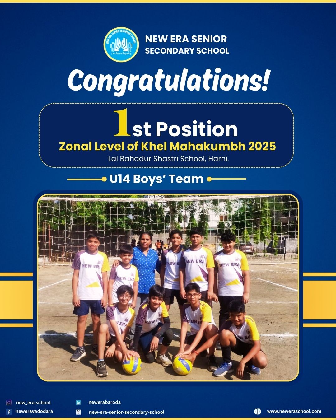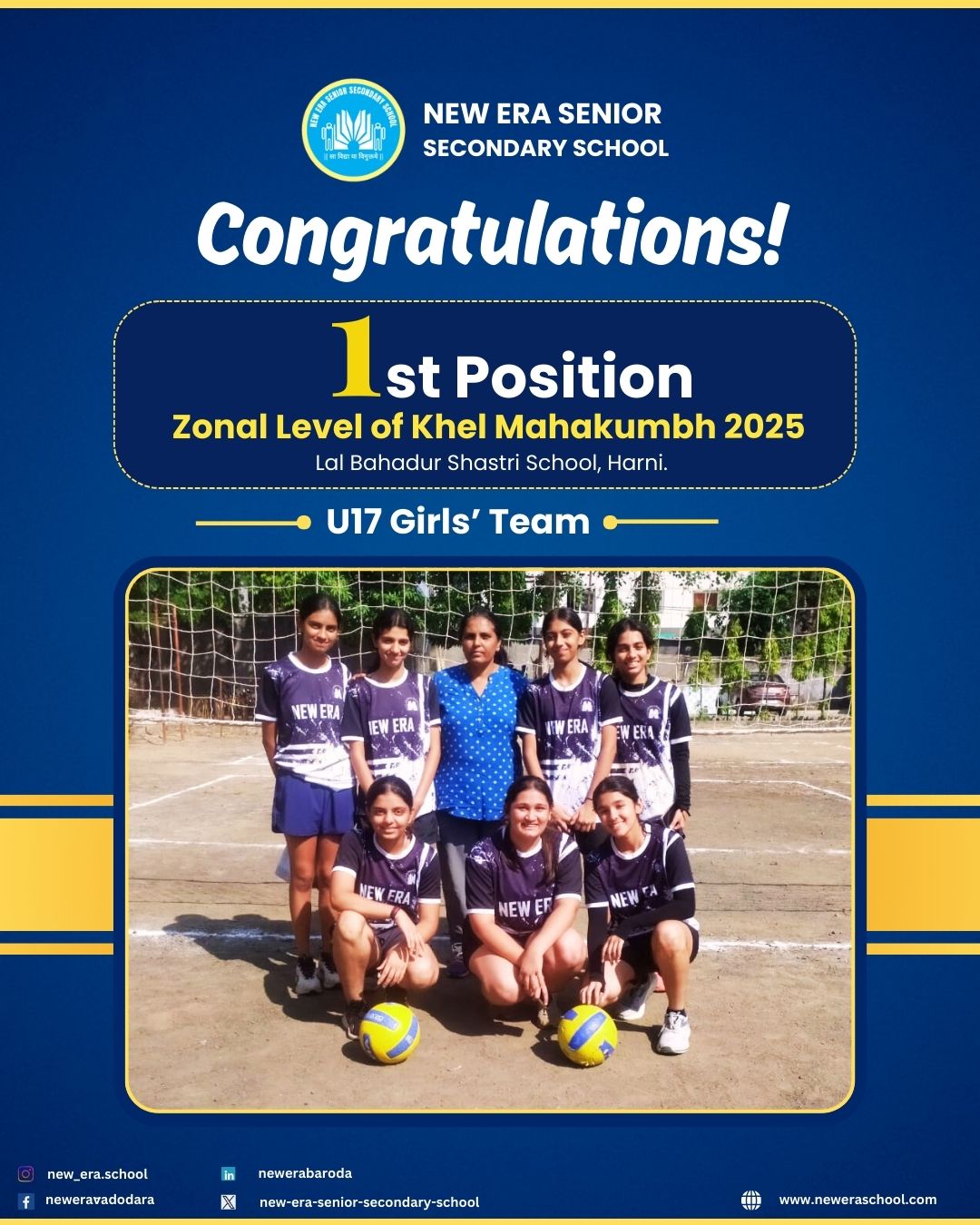 New Eraites Bring Laurels at Zonal Level of Khel Mahakumbh 2025 New Era Senior Secondary School proudly celebrates the outstanding achievements of its young athletes at the Zonal Level of Khel Mahakumbh 2025, held at Lal Bahadur Shastri School, Harni. U17 Girls’ Team – 1st Position Team Members: Shakshi Patel, Vidhi Dand, Reeva Jain, Rashi Mahajan, Hirva Patel, Saanvi Pawar, Panthi Patel U14 Boys’ Team – 1st Position Team Members: Vatsa Shah, Kriday Vala, Saumya Shah, Kashyap Patel, Aksh Patel, Tanay Mungra, Shivansh Shah, Ved Sojitra, Karan Patel, Anay Wani U17 Boys’ Team – 2nd Position Team Members: Nishil Pandya, Milit Gandhi, Samarth Shah, Parth Rajpal, Harsh Gurung, Jaival Makadia, Viraj Soni, Nimay Patel Congratulations to all the champions for their remarkable performances and for making the school proud!