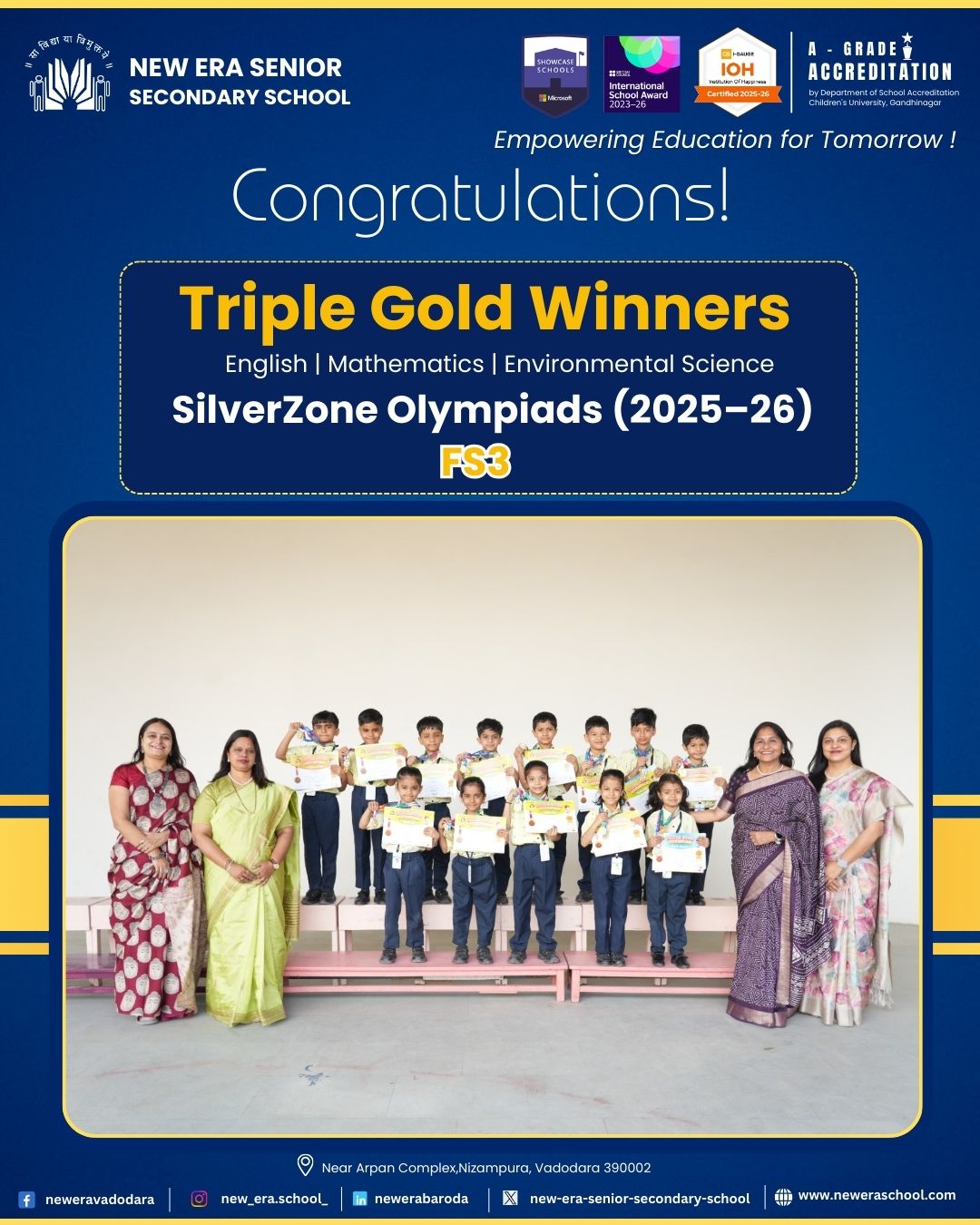 We are proud to announce that the Triple Gold Winners in English, Mathematics, and Environmental Science from FS 3 are Aatman Shah, Drashti Patoliya, Henil Khatri, Kiara Parikh, Yukta Ghongada, Meha Thoria, Hridhaan Ajmera, Jishnu Shah, Reeva Jain, Hemchandra Shenoy, Kiaan Parikh, Mantra Patel, and Vedansh Deshpande.