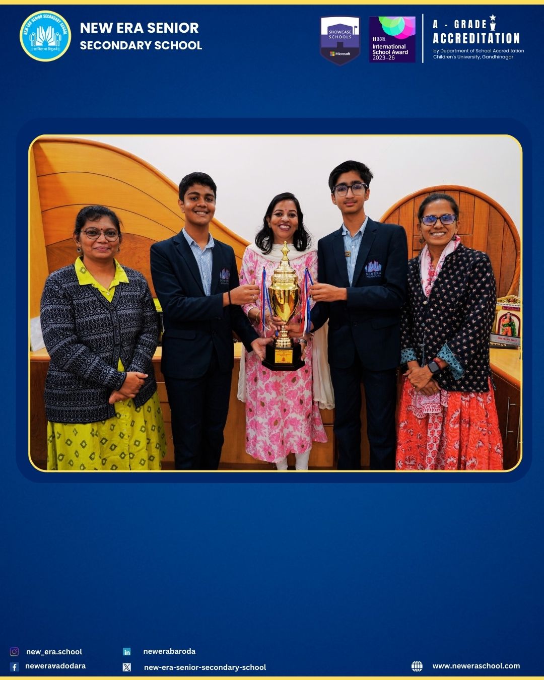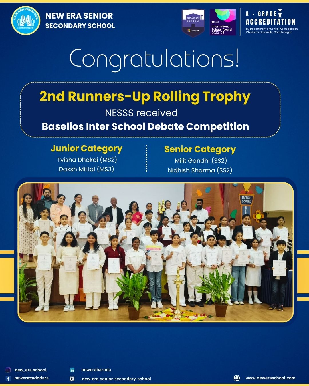 New Era Senior Secondary School, Vadodara proudly secured the Second Runners-Up Rolling Trophy at the Inter School Debate Competition – Baselios Rolling Trophy, bringing honour and pride to the school community.