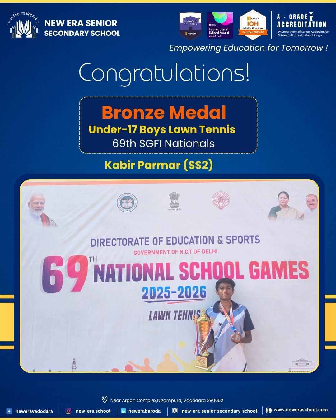 New Eraite, Kabir Parmar (SS2) proudly represented Gujarat in the Under-17 Boys Lawn Tennis at the 69th SGFI Nationals in Delhi, leading the team to a Bronze Medal. In a crucial tie, he won his singles match to keep Gujarat in contention, and then, along with his partner, staged a stunning comeback from 0–3 to win the deciding doubles 7–5, sealing the medal.