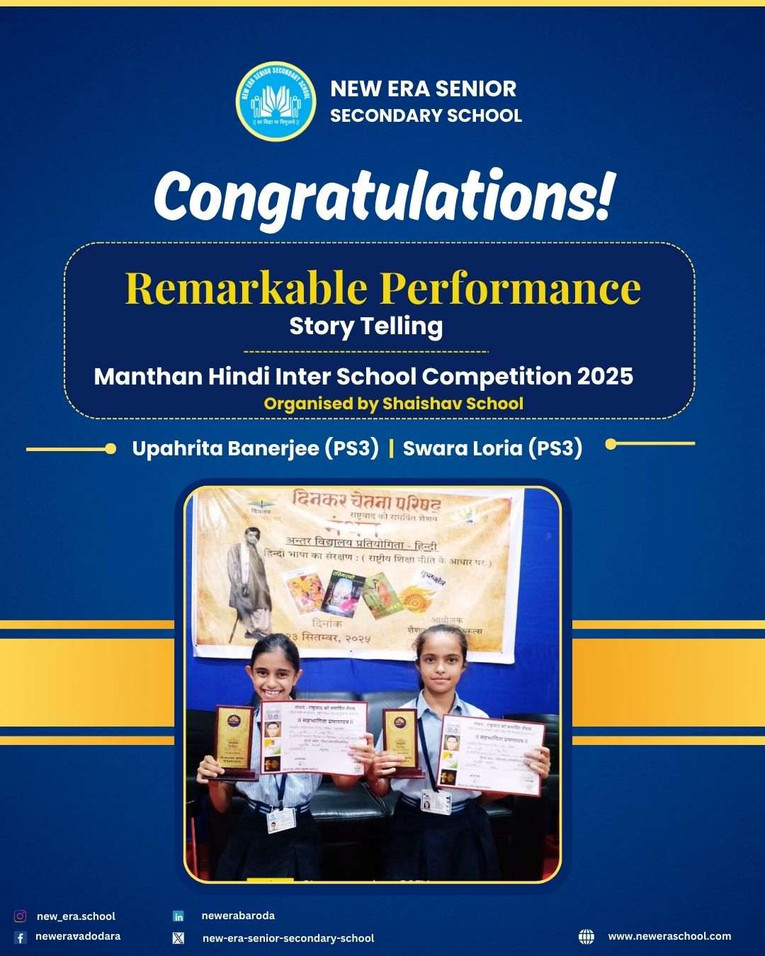 Our young New Eraites made us proud at the Geeta Chanting Competition 2025 organized by Chinmaya Mission! Nivan Raval (UKG-C) secured the 1st position at the City-level final round and qualified for the State-level competition, among 1200+ participants from various schools.