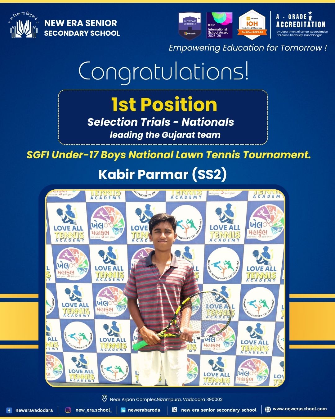 Kabir Parmar of SS2 has secured 1st position (tied) at the SGFI Under-17 Boys Lawn Tennis selection trials held at Bharuch, showcasing exceptional skill and determination.