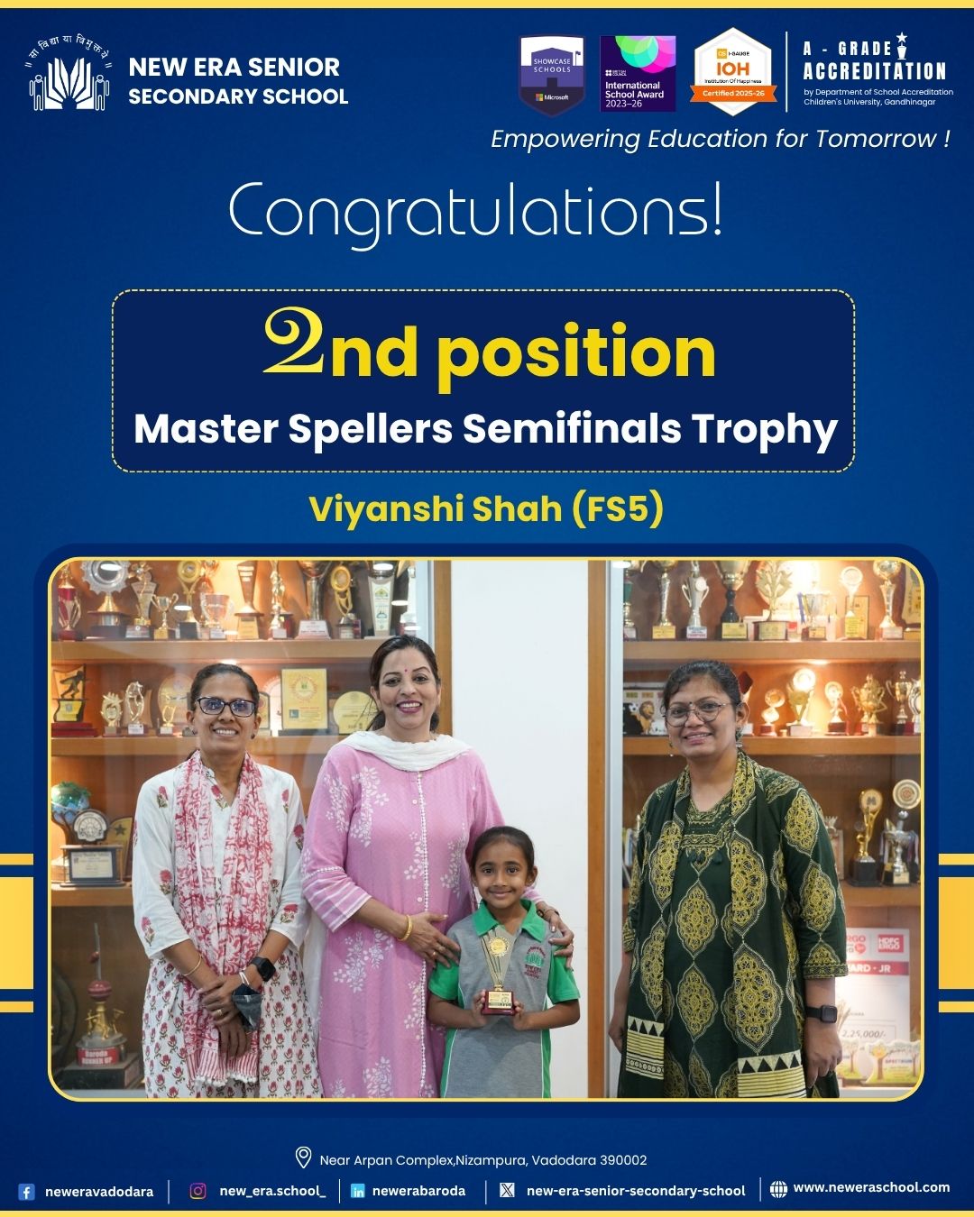 New Eraite Viyanshi Shah (FS5) has achieved an outstanding milestone by securing 2nd Position at the Master Spellers Semifinals, earning the prestigious trophy for her remarkable spelling excellence.